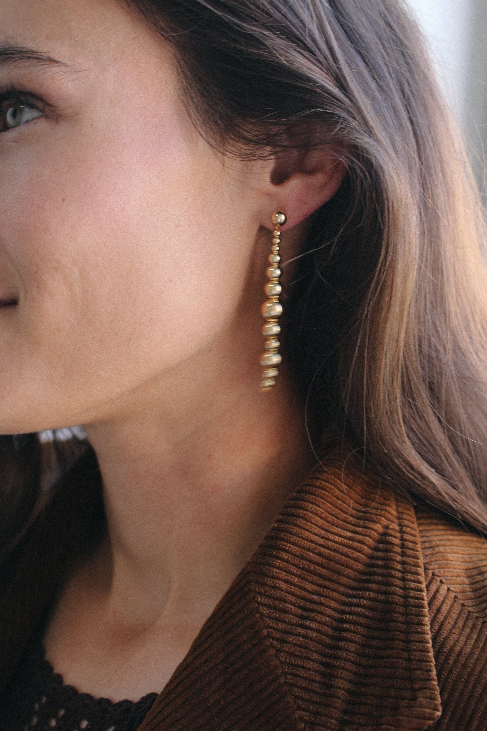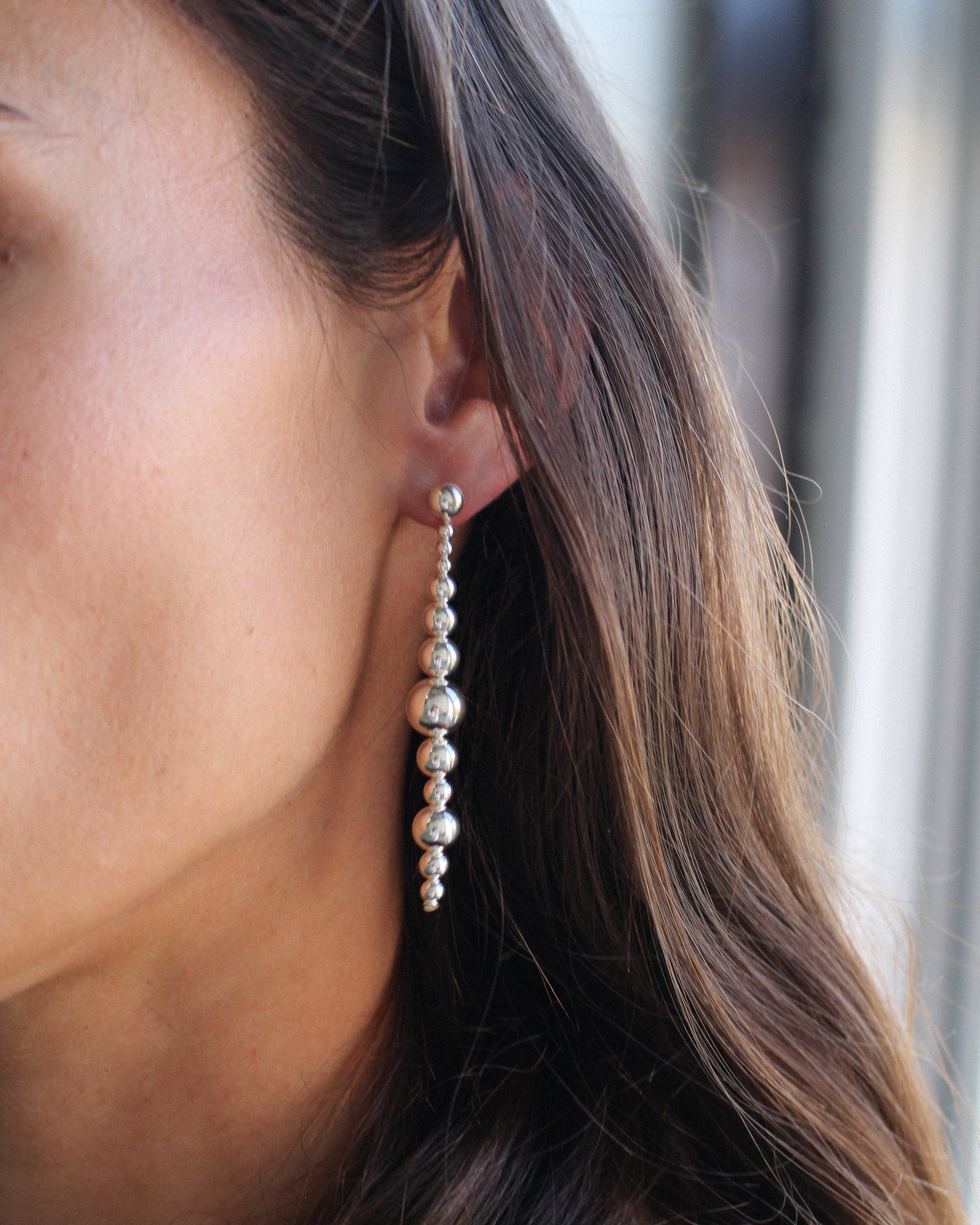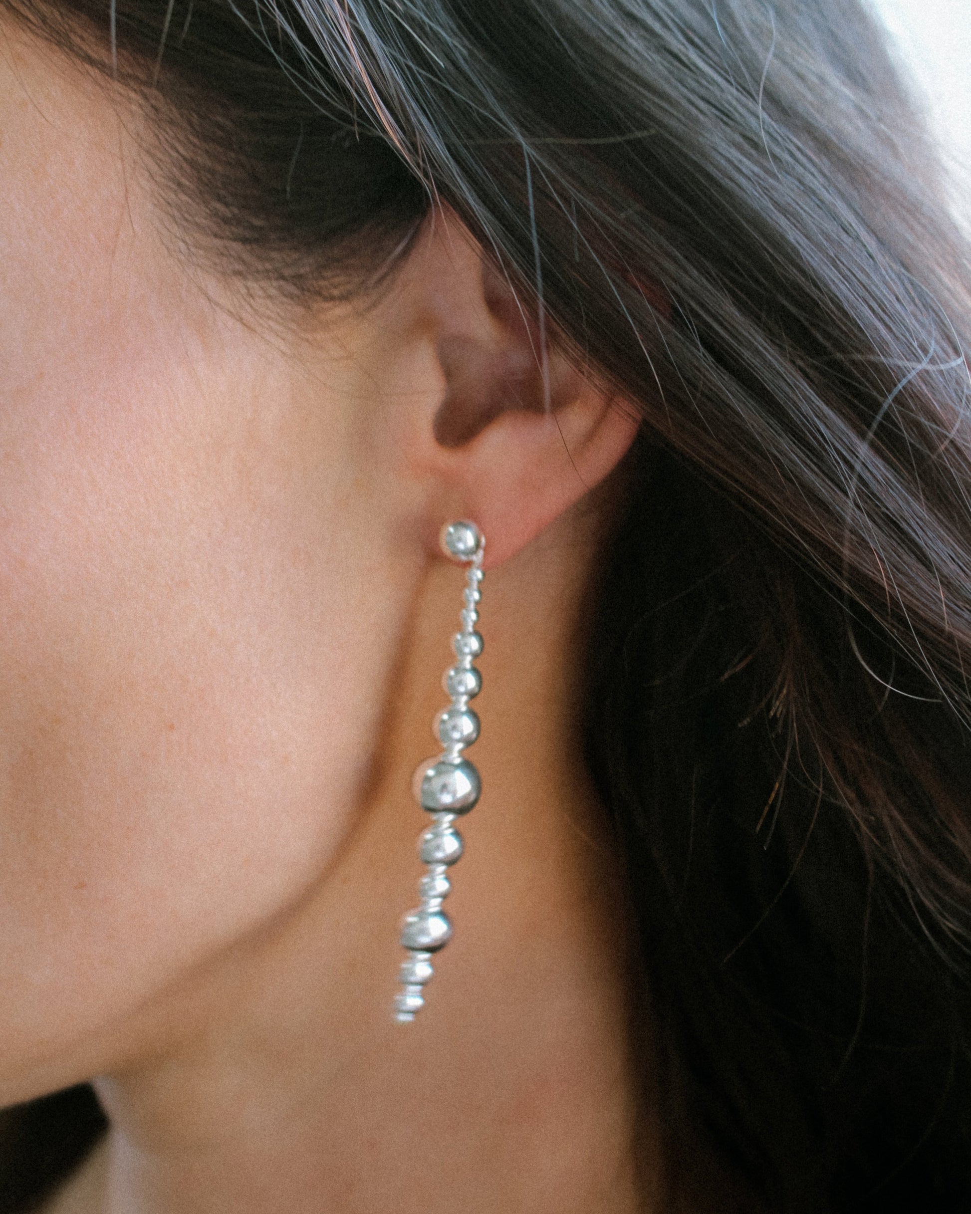 Sculptural sterling silver or 14K yellow gold-filled drops, fluid and molecular in form. Designed for versatility, the detachable drops can be slipped off the post to be worn in front or behind the ear—or even as a pendant. A dynamic piece in constant motion.