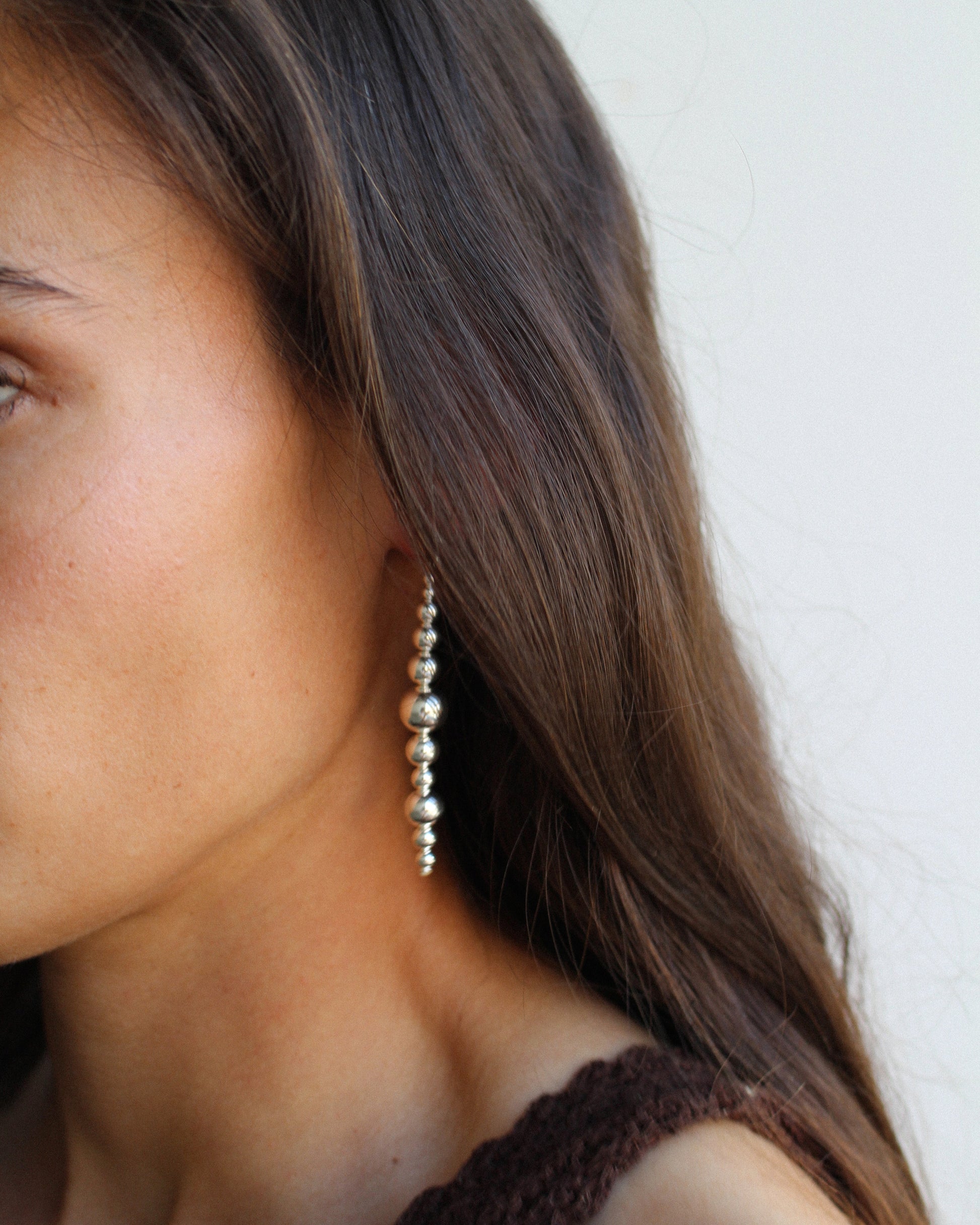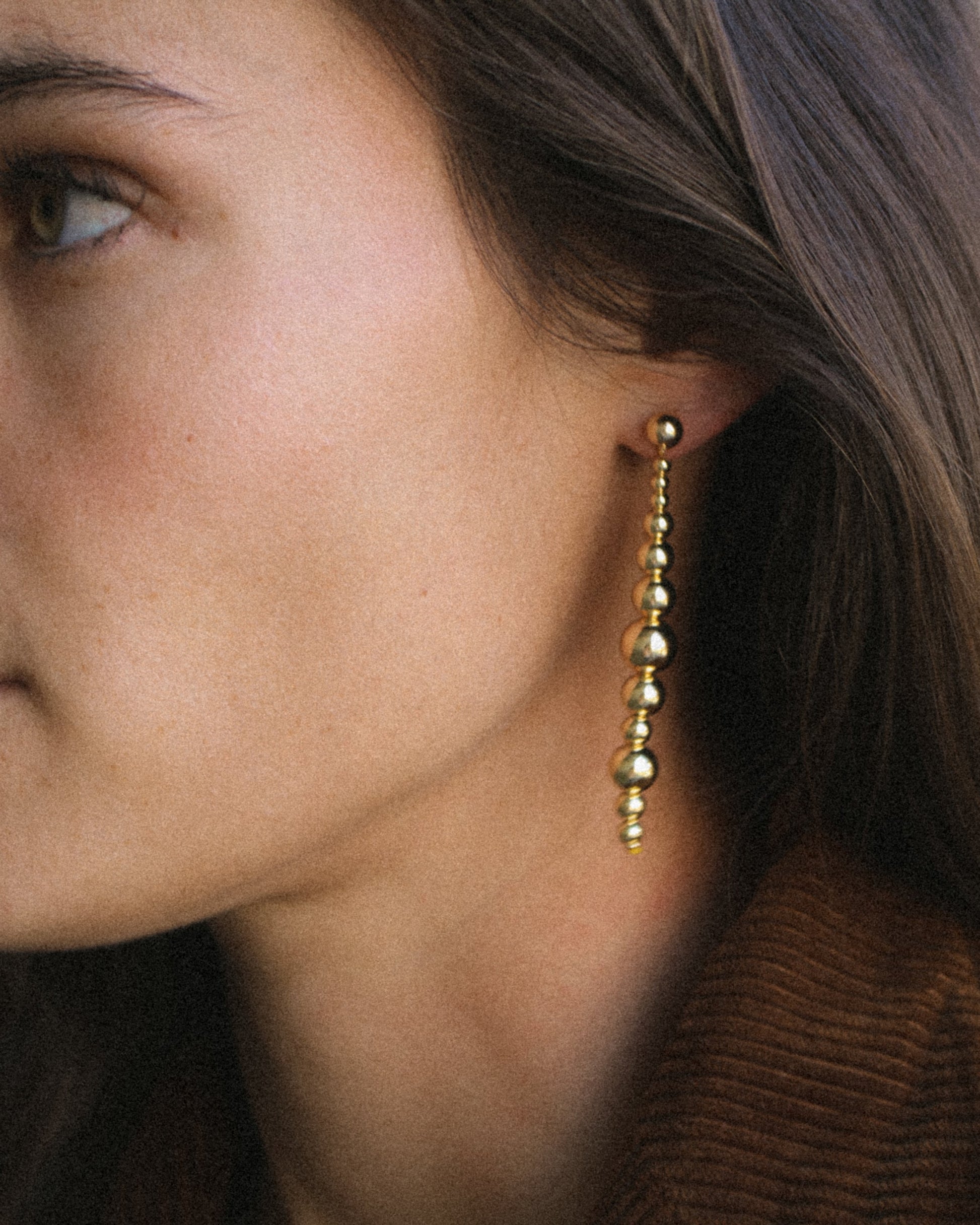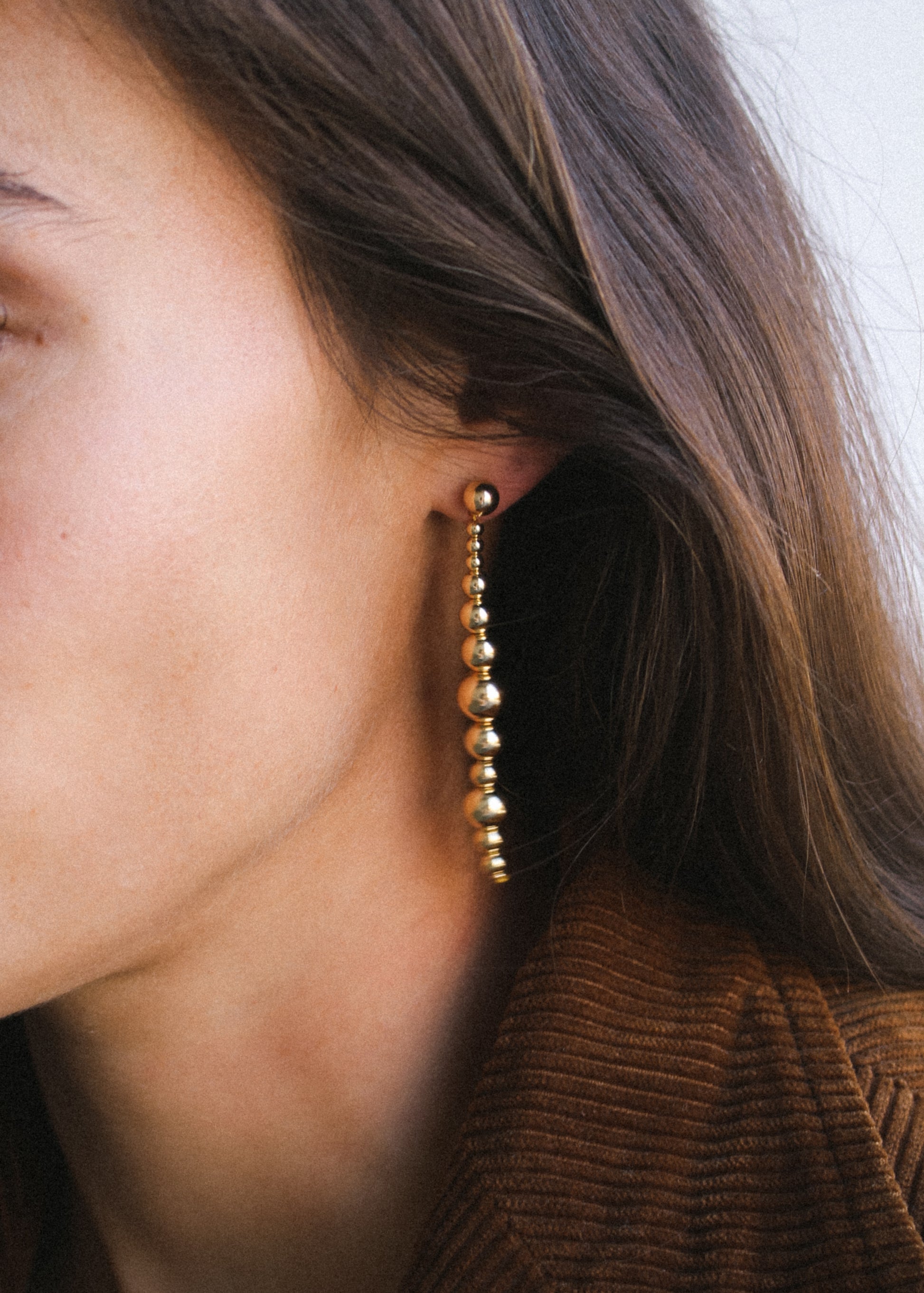 Sculptural sterling silver or 14K yellow gold-filled drops, fluid and molecular in form. Designed for versatility, the detachable drops can be slipped off the post to be worn in front or behind the ear—or even as a pendant. A dynamic piece in constant motion.